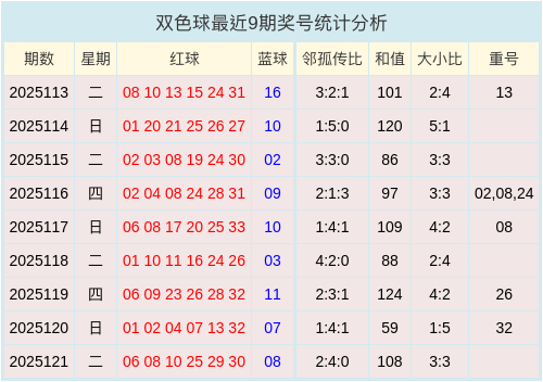 双色球最近9期奖号数据图表